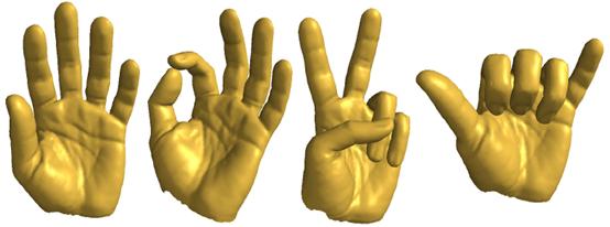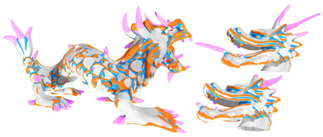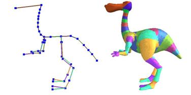 为获得骨架对网格面片的控制关系,本项研究中还提出了一种新的基于骨架的网格分片算法。基于给定骨架,该算法利用面片到分支的空间距离和面片到分支的网格上最短路径作为聚类准则,可以快速、鲁棒地计算网格分片。如果给定骨架的连接点位置不合理,本算法可以通过Graph-Cut方法对该连接点处的网格分片进行调整。