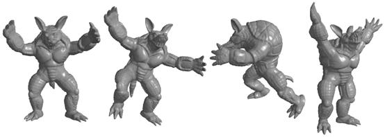 在本项研究中,抛弃了传统骨架变形方法用分支直接控制顶点的思路,提出使用分支控制单形的几何变换,并通过几何变换能量函数的全局优化求解确定网格顶点变形后的位置。用本方法求解骨架变形问题,有如下优点:首先,使用分支控制单形,意味着直接使用了网格中顶点和顶点间的连接关系和网格的局部形状信息。传统骨架变形方法没有直接使用这一关系,面片间的连接关系只能通过权重的分配体现出来。其次,通过对几何变换能量函数的全局优化求解,可以将骨架连接处面片间的位置误差传播到邻近面片上。因而即便不使用权重,该算法也可以获得光滑、均匀的变形结果。此外,通过在优化方程的目标函数中引入单形变换的平移变量,本方法求解时无须固定任何顶点,并可保证网格变形结果与变形的骨架保持紧密一致,克服了以往单形变换的变形方法中变形结果与固定顶点选择相关的缺点。