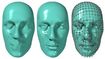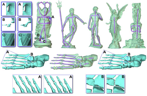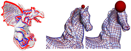 基于积分不变量和特征敏感度量,提出了一个新的特征敏感几何处理的研究框架,研究了鲁棒的几何特征分类与编辑、基于特征敏感参数化的表面拟合、特征敏感的网格模型分割、鲁棒的多尺度主曲率估计等,取得了国际领先的研究成果。其核心思想是将三维模型映射到高维空间,利用高维空间的特征敏感度量进行几何处理。 提出了一种新的鲁棒地处理特征的整体形状的方法,在三维模型上得到了尖边、脊、谷和刺等特征区域。我们利用网格重剖算法获得基于特征敏感度量的各向同性网格,在此基础上,可通过局部邻域内的积分不变量识别多尺度的特征区域。既而,使用数学形态学的方法以及平滑操作实现特征区域的提取并进一步分类为一些基本的类型,例如脊、谷和刺等。获得的特征区域的表示还可以应用于针对特定特征的曲面编辑操作。图1-1为特征分类和编辑的示例。