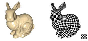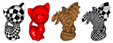 可以看到棋盘格的纹理局部正交性质在参数化过程中并没有改变。而于此同时,共形参数化却带来了参数域的面积扭曲,这会直接影响到纹理映射、网格重采样等应用的效果。此外,网格具有拓扑连接信息,如何针对不同亏格(Genus)的网格模型采用统一的参数化方法,是另外一个重要的问题。