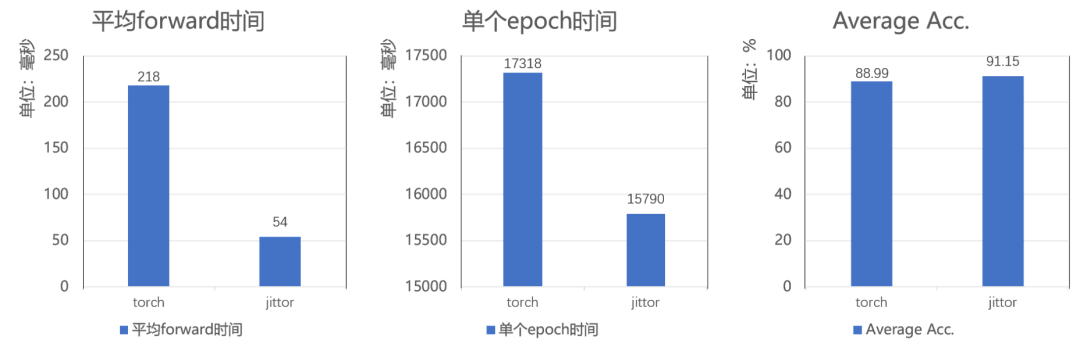 我们还在Emotion-Gait数据集上进行全面对比实验,所有实验都在单张3090显卡上测试。如图10所示,基于计图框架的代码在forward时间上减少了75%,在单轮epoch上取得了1528ms的提升,性能指标平均准确率取得了2.16%的提升。