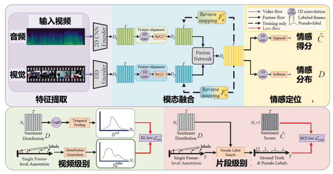 为进行精准视频情感定位,团队提出了一种弱监督框架TSL-Net,如图3所示,使用单帧监督即可训练多模态融合网络来定位视频中的情感,显著降低了密集标注成本。具体而言,该方法通过贪婪搜索策略为未标注帧生成伪标签,并融合视觉与音频模态的情感特征以预测时间情感分布。在特征融合过程中,设计了反向映射策略,并引入对比损失以保持原始特征与反向预测之间的一致性。