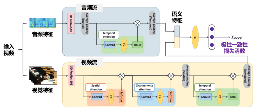 针对情感抽象难理解,团队提出了首个端到端用户生成视频情感分类的方法VAANet,无需辅助数据,仅靠视觉与音频输入即可完成训练。如图4所示,通过3D CNN提取视频帧特征、2D CNN解析音频频谱,再结合空间、通道与时间注意力机制,VAANet精准捕捉情感线索。同时,创新引入极性一致交叉熵(PCCE)损失函数,让模型感知情感方向。
