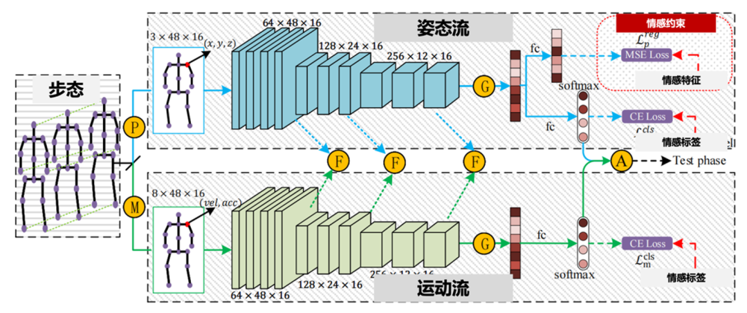 针对清晰视频难获取的场景,例如夜晚缺乏足够光线,团队提出了一种步态情感视频理解方法,构建了一种双向姿态与运动图卷积网络,如图5所示,该网络由两条并行流组成,分别为姿态流和运动流,从两个视角进行情感识别。姿态流旨在显式分析个体的情感状态。该方法通过基于人工特征的新型回归约束,将先验情感知识蒸馏到网络中,从而增强情感表示的学习。运动流旨在描述情感的强度,这是一种隐含线索,可辅助情感识别。为实现这一目标,该方法使用高阶速度-加速度对构建图,从而利用富含信息的运动特征。