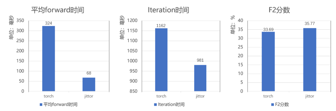 我们在TSL-300数据集上进行全面对比实验,所有实验都在单张3090显卡上测试。如图9所示,基于计图框架的代码在forward时间上减少了接近80%,在单个lteration上取得了181ms的提升,性能指标F2分数取得了2.08%的提升。
